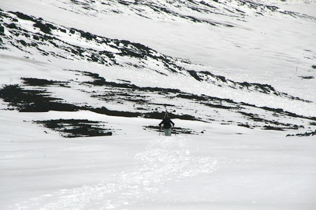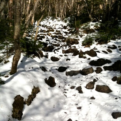 登山道は雪で真白だけど、砂や岩の上をスキーブーツで歩くよりは遥かに快適。