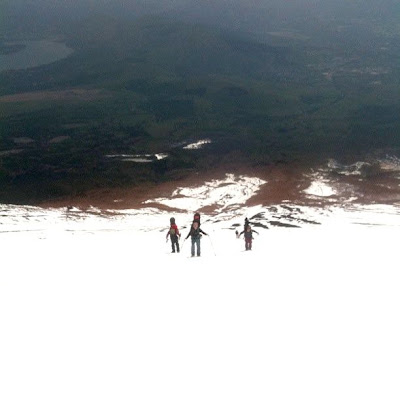 先行していたテレマーカーが、滑ってきた。上部は風が強そうだったので聞いてみると、3400mくらいではすでに斜面がカチカチなので、無理せずに降りてきたとのこと。ふむふむ。