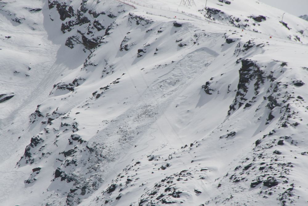 ZermattのGantロープウェイ山頂駅から延びる尾根、東向き斜面で起きた雪崩。